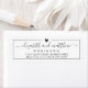 Rótulos de Endereço de Devolução de Casamento Elegantes e Modernos em Preto e Branco com Letra à Mão. Com um lindo modelo de nome de noiva e noivo escrito à mão com fonte de cauda em preto, pequeno coração no topo, em torno de uma moldura fina em fundo branco. Fácil de personalizar com seus nomes e informações de endereço de devolução.