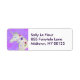 Uma etiqueta de endereço de retorno com um unicórnio branco em um fundo roxo.