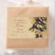 Ilustração de ameixas roxas com folhas verdes, sobre fundo bege com texto colorido russet, feita a partir de uma pintura de safra. O rótulo é criado para enlatar ou engarrafar casas de doces, geleias e conservas. Você pode deixar o espaço de data para escrever ou mudar para a data em que seu emperramento ou gelatina foi feito.