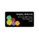 Estas etiquetas de endereço de retorno apresentam ilustrações coloridas de jogos de papel ou dados de jogos de fantasia em um fundo preto com seu nome e endereço em letras brancas.