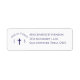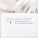 Design left features the elegant image of a cross displayed between the initials of the soon-to-be bride and groom. Return address is displayed beside image in proper format. All text and images are featured in navy-blue against a white background. Designed to coordinate with the Timeless Catholic Monogrammed Wedding Suite.