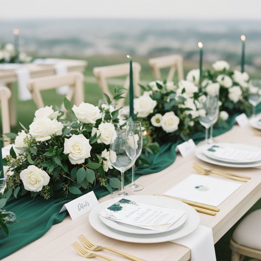 This timeless botanical design features a sophisticated blend of rich emerald green foliage and soft beige and blush roses. The neutral, earthy tones are carefully balanced to create an elegant fine-art aesthetic that adds a high-end touch to any wedding or special event detail.