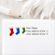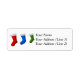 Este design de etiquetas apresenta 3 meias de Natal; uma é vermelha, uma é azul e a outra verde.