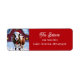 O estilo country natalino retorna etiquetas com a ilustração de uma vaca festiva num chapéu de Papai Noel em frente a um lindo celeiro vermelho decorado em luzes de Natal e uma coroa festiva num dia de inverno de neve. Adicione um toque de vida fazenda aos envelopes do cartão de Natal.