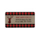 O lado esquerdo destas etiquetas de endereço de volta de Natal rústicas apresenta um retrato vermelho e preto de cervo de xadrez de búfalo. O lado direito mantém seu texto personalizado em vermelho e preto, colocado em um banner de bronzeamento. O topo e o fundo estão bordados no mesmo impressão de búfalo vermelho e preto que está no veado.
