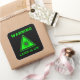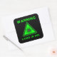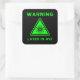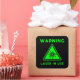 Aviso - laser no uso - etiqueta preta com rotulação verde-clara e sinal de aviso do laser.