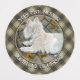 Sazonal Fall Autumn West Highland White Terrier deitado em um pátio de pedra com folhas caídas. Cachorro ocidental a espreitar por um arbusto florescente. Isobel. Copyright © 2025 Angi Laframboise. Todos os direitos reservados. Dons de cães de arte para amantes de cães.