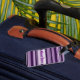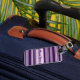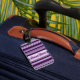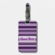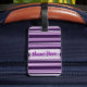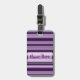 Tiras horizontais, púrpuras e brancas, grossas e finas, etiquetas de bagagem.