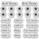 Adicione o diário de leitura ou o diário de marcadores com estes adesivos de revisão de livros. Use os adesivos de estrela para dar uma resenha estrelada ao livro e escolha um adesivo "Amado!" "Gostado" "Não é o meu favorito" "Odiava" "Ok" ou "Novo Favorito!" para combinar com a sua resenha do livro.
