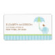 Etiquetas de endereço com um elefante azul giro e uma ave segurando um guarda-chuva. Design perfeito para chás de fraldas, anúncios de nascimento ou festas de aniversário infantis. Arte por estúdio de cacau