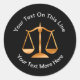 O adesivo de mensagem do escritório do Classy Attorney com o texto que segue a forma redonda do adesivo que você pode personalizar online. Projetado para um Advogado para promover sua marca, promover uma mensagem ou evento especial e é criado com uma escala dourada de justiça.