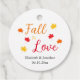 Apaixonar-se por presentes personalizados de eventos com paleta de cores vermelha, laranja e amarela de outono com folhas de maple. O texto pode ser personalizado para um casamento, chá de panela, chá de fraldas ou qualquer outro evento