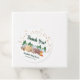 Etiquetas bonitas para o seu chá de fraldas com uma ilustração aquática de animais da floresta acampar com a tenda nas montanhas e na floresta, uma camada de estrelas de ouro, e "Obrigado!", "Aventura Aguarda" e o nome da futura mãe num roteiro verde da floresta.