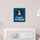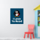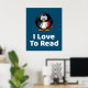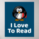 Pinguim bonito e engraçado "Eu adoro ler" segurando seus livros.