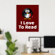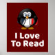Pinguim bonito e engraçado "Eu adoro ler" segurando seus livros.