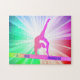 Luzes lindas coloridas quebra-cabeça com ginasta de ginástica no feixe de balanços.