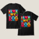 A design da camiseta apresenta a frase "Eu amo meu cachorro" em letras ousadas e brincalhonas, com um símbolo cardíaco substituindo a palavra "amor". Abaixo ou ao redor do texto, há ilustrações bonitinhas relacionadas a cães, como estampas de pata, ossos ou uma silhueta de um cachorro. O design dá uma vibração quente e divertida, perfeita para os amantes de cachorros expressarem seu afeto por seus companheiros peludos. A paleta de cores é simples e alegre, com cores contrastantes para fazer o pop de design numa variedade de fundos de camisetas.