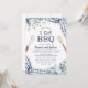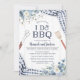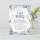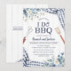 Convide convidados para um tema azul Eu faço chá de casais de CHURRASCO ou janto de ensaio casual para celebrar o casal feliz! Este convite apresenta florais azuis empoeirados de aquarelas com acentos de gingham marinho contra conselho de celeiro de lavagem branca.