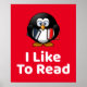 Pinguim bonito e engraçado "Eu gosto de ler" segurando seus livros.