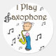 Um saxofone de figura de palito com notas musicais e texto que lê "Eu toco saxofone" em autocolantes personalizáveis.