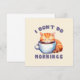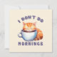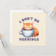 Aceite a grumidez matinal com este cartão de saudação adorável, com um gato laranja giro e a frase espirituosa, "Eu não faço manhãs." Perfeito para amantes de gatos, entusiastas de café, e corujas noturnas, este design brincalhão captura a essência daqueles que precisam de café antes de tomar o dia. Um presente excelente para entusiastas de gatos e personalidades matutinas rabugentas, também!