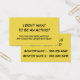 Na frente, dois blocos de texto com espaço leram: "Eu não queria ser um ativista... então essa loucura aconteceu e eu não podia mais ficar quieto." No verso: "Agora faço chamadas quase todos os dias" e configurações de espaço para adicionar dois nomes de senadores e números de telefone que você quer lembrar de ligar... e ajudar seus amigos a se lembrarem de ligar. Para ajudar aqueles que agora pedem regularmente que o seu funcionário eleito saiba o que pensa sobre a legislação atual. O modelo foi configurado para que você possa alterar mensagens e também números. Digite o número, o representante, o governador ou outra organização ou pessoa do seu senador.