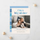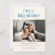 Este anúncio de irmã/nascimento bonitinho apresenta as palavras "Sou uma irmã mais velha" em tons de azul no topo, com espaço para uma foto de solteiro, assim como informações sobre sua chegada mais recente. A parte traseira da placa tem um padrão de faixa azul que coordena a cor.