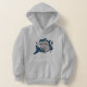 Desenhos animados engraçados de um tubarão com dentes e forquilha e faca enormes.