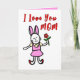 O cartão apresenta um trabalho de arte de mão original de um coelho segurando uma flor vermelha. As matizes cor-de-rosa, juntamente com a flor vermelha, simbolizam o amor e o afeto, fazer-o um cartão perfeito para dar às mães da sua vida. Ao lado da mensagem "Eu te amo mãe", este cartão é uma maneira bela e divertida de expressar seu amor e honrar sua mãe durante o período. Perfeito para Dia de as mães e aniversários.