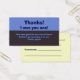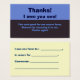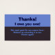 "Obrigados! Eu te devo uma!" Isto é o que este cartão diz na frente, junto com "Este cartão é bom para um favor de retorno. Resgatar devolvendo para mim. Obrigados de novo!" No verso você pode escrever informações mais específicas sobre o favor. Você sabe como isso funciona; alguém faz um grande favor para você, e você diz "Obrigados, eu te devo um", mas...eles realmente não acreditam nisso. Com este cartão você pode mostrar que você realmente aprecia sinceramente o que eles fizeram por você, e demonstrar que você realmente pretende ajudá-los quando eles precisarem. Claro, aquela área atrás onde diz "Comentários" é um bom lugar para escrever o que você não fará por eles haha...como pintar a casa deles, ou dobrar a verdade para tirá-los de um lugar apertado; seus limites são para você. Isso é "meio que" só por diversão, mas então, novamente, como eu disse, às vezes você quer que as pessoas realmente sintam o impacto de sua dívida profunda de gratidão, e isso fará de uma forma relâmpago sem que nenhum de vocês se sinta desconfortável.