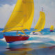 "Eu vi três barcos" paisagem marinha. Uma paisagem sazonal colorida e descansada no estilo de uma aquarela. Com barcos à vela num mar instável. Cores de azul vibrante e amarelo.