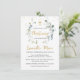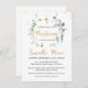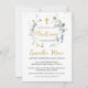 Este design apresenta uma ilustração de folhagem verde e folhas de eucalipto em estilo aquarela. Na parte superior da placa há uma imagem de confetti de efeito cruzado e ouro / esverdeado.