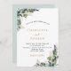 Um fundo branco decorado com verde de eucalipto e folhas de ouro. Personalize e adicione seus nomes e detalhes do casamento. Letras pretas e ouros coloridas.
