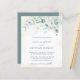 Elegante convite de casamento orçamentário com folhas de eucalipto e verde juntamente com os detalhes de seu evento sobre uma lavagem a aquarela pastel. A parte de trás é uma sombra correspondente de verde azul macio. Esta simples e rústica design é excelente para um casamento de temas botânicos no verão. Estes convites baratos de casamento são impressos em folhas de papel para uma opção econômica.