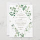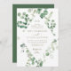 Um design de casamento verde com uma estrutura foliar com texto no meio e lindas folhas verdes de eucalipto, Você pode mudar o texto, tamanho do texto, cor e fonte neste convite de casamento.