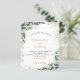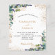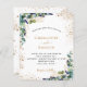 Um fundo branco decorado com verde de eucalipto e folhagem de ouro. Personalize e adicione seus nomes e detalhes do casamento. Letras pretas e ouros coloridas. Voltar: adicione seu weburl ao seu site de casamento para RSVP ou detalhes.