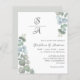 Design botânico elegante em aquarela. Este design único apresenta eucalipto e verde em verde sábio e azul empoeirado. Todo o texto é editável para atender às suas necessidades com o recurso adicionado de um monograma no script clássico.