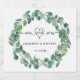 Fundo branco, texto preto. Decorado com uma coroa verde de eucalipto. Sr. e Sra. com coração. Personalize e adicione seus nomes e a data.