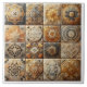 Uma coleção impressionante de azulejos decorativos mostra padrões intrincados em tons quentes de laranja, ouro e azul. Cada azulejo apresenta um design geométrico único, que combina arte e artesanato.