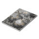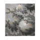 Um objeto esférico com uma superfície refletora se senta de forma destacada entre padrões complexos e fractais com vários tons de cinza, preto e ouro. Os intrincados padrões aparecem quase como uma paisagem texturizada, enquanto a esfera age como uma lente distorcendo e comprimindo os detalhes ao redor.