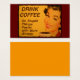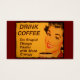 Uma mulher sorridente com batom vermelho retrorado e unhas bebe sua xícara de café da manhã. A legenda diz "Beba café - Faça coisas estúpidas mais rapidamente com mais energia."