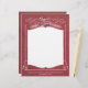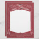 Bonito cartaz ou papelaria de Natal com moldura ao estilo vitoriano, fundo vermelho sujo, pratos de prata e pínus, perfeito para as festas de janto e salgadinhos.