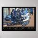 Policiais em motocicletas à espera de lançadores com as palavras "Vá em frente e acelere - Faça o meu dia"