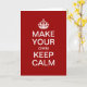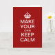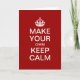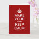 Um cartão de saudação de modelo que você pode usar para facilmente fazer seu próprio cartão "Mantenha-se Calmo" e "Continuar com a Paródia". Todo o texto pode ser alterado, redimensionado ou excluído. A coroa também pode ser editada. Mostrado com um fundo vermelho. Isso pode ser alterado para qualquer cor que você quiser, pressionando o botão 'personalizar'. Permite fazer uma placa completamente personalizada. A dentro da placa foi deixada vazio para você adicionar sua própria mensagem.