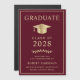 Lindo anúncio magnético de graduação universitária em vermelho borgonha com um chapéu de graduação dourado e tipografia moderna dourada para o nome do graduado, ano de conclusão, faculdade ou universidade, grau e curso ou honrarias.