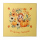 Uma fada de abóbora bonita segurando uma abóbora talhada feliz cercada por uma coroa de flores, abóboras e folhas de outono.