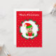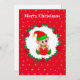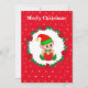 Fada de Natal fofo, grinalda de pinheiro, poinsétia, bolas e estrelas douradas em cartão de Natal vermelho. Todo o texto pronto para ser personalizado.