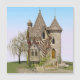 Renderização digital em 3D de um castelo de conto de fadas num prado verde, fundo azul
