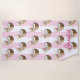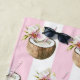 Esta toalha de praia de cor rosa e listrada branca tem bebidas pina colada tropicais servidas num abacaxi com uma flor de orquídea e pode ser personalizada com um nome e título de festa de noiva clicando em "personalizar esta modelo".
