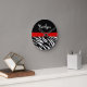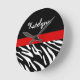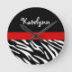 A tendência e o relógio personalizado fofo das faixas de zebra apresenta faixas brancas de zebra e uma borda vermelha de sotaque em um fundo preto. Personalize com seu nome, iniciais ou outro texto. Clique no botão "Personalizar!" para alterar o tamanho da fonte, a cor da fonte, o estilo da fonte e muito mais!